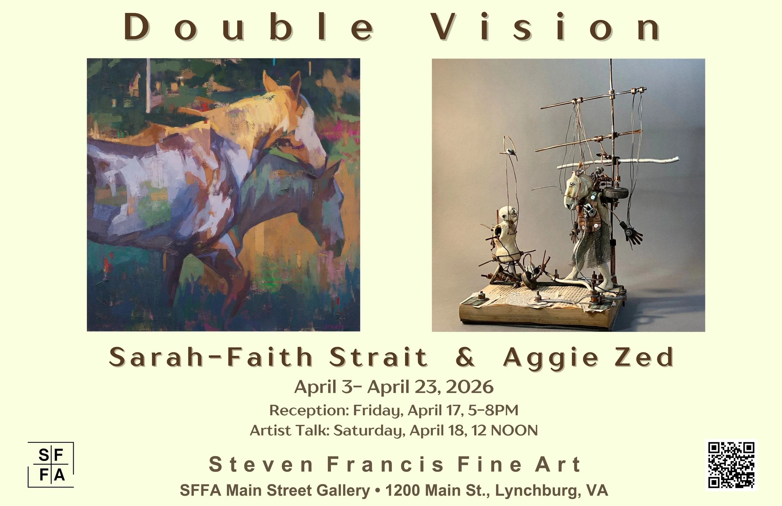 Double Vision | Sarah-Faith Strait & Aggie Zed (Dual Exhibition) Friday, April 3, 2026 8:00 AM 08:00 Thursday, April 23, 2026 9:00 AM 09:00 Steven Francis Fine Art Gallery 1200 Main St Lynchburg, VA 24502 United States (map) Google Calendar ICS Showing April 3 - 23, 2026Reception: Friday, April 17, 5-8pmArtist Talk: Saturday, April 18, 12-Noon