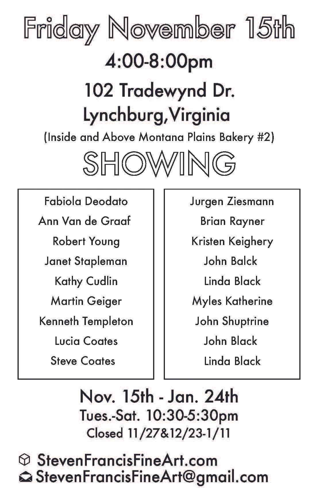 Participating artists include: Lincoln Perry, Martin Geiger, Philip Geiger, Elizabeth Geiger, Rosalie White, Lucia Coates, Frank Hobbs, Richard Crozier, Robert Bricker, Ken Templeton, Allen TenBusschen, Sarah-Faith Strait, Ann Glover, Max Mitchell, Laura Vahlberg, Elise Schweitzer, Bill White, and Aggie Zed
