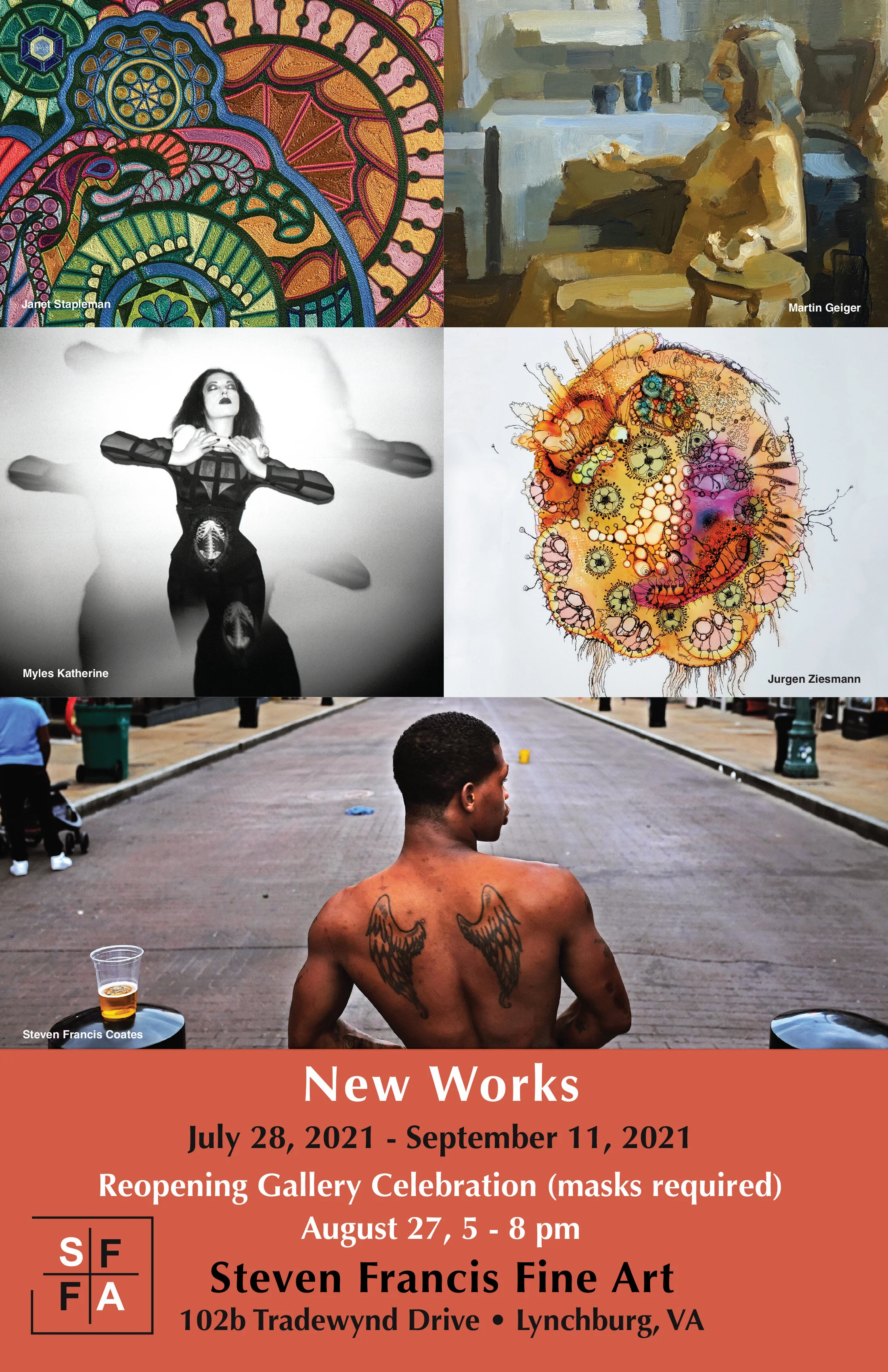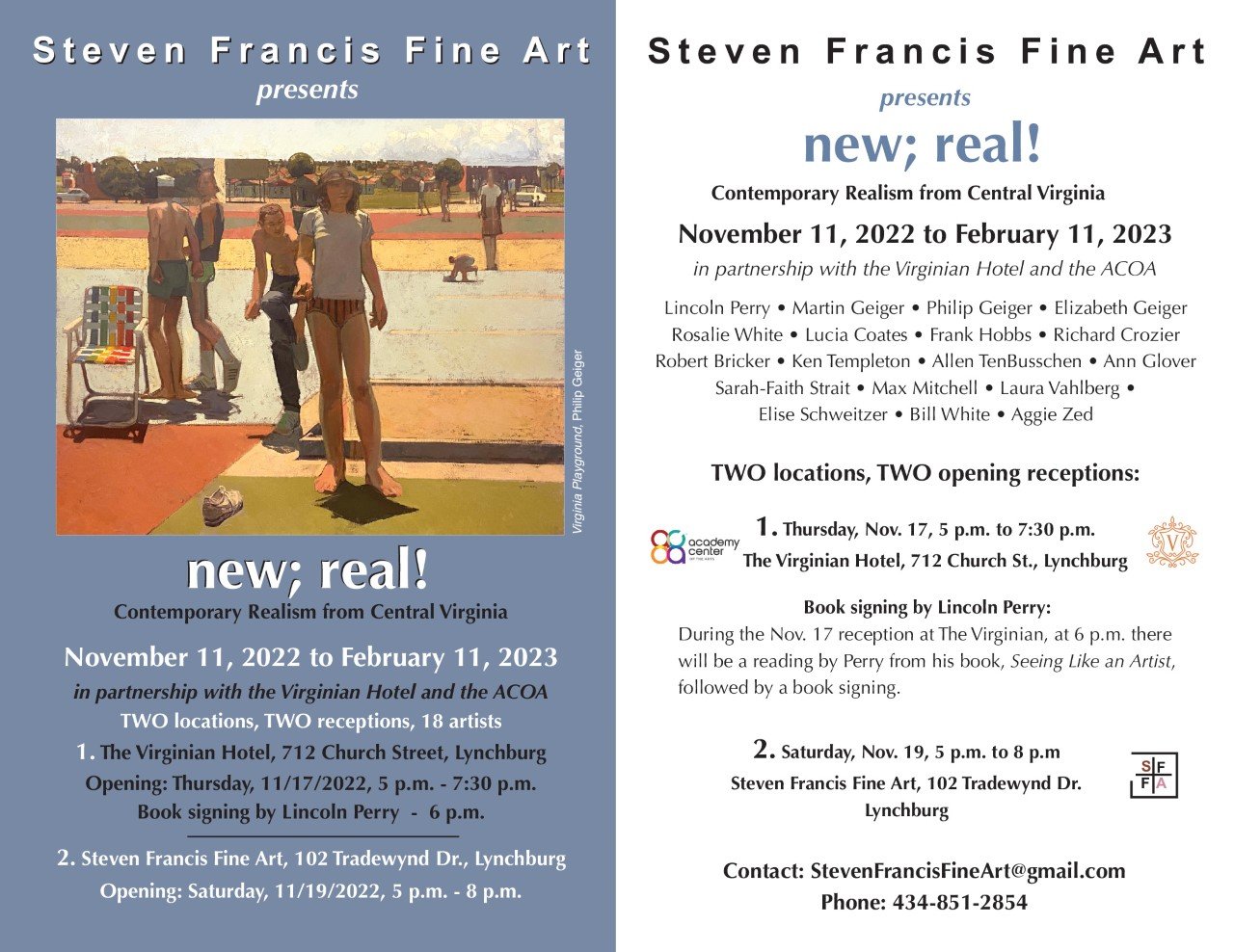 A unique multi-location exhibition featuring well-known and celebrated Central Virginia artists as well as emerging artists. The title, “new;real!” refers to the representational work by these artists who work in recognizable subject matter but approach their work with full understanding of the contemporary practices of the late 20th and early 21st century- and who bring their own unique style and vision to their art. The dominant movements of Abstract Expressionism, Conceptual Art, and many more contemporary ways of thinking about art have challenged artists to see differently, to pull away from older forms of painterly realism, and to find new and interesting ways to express visual reality while still adhering to recognizable forms and subject matter.